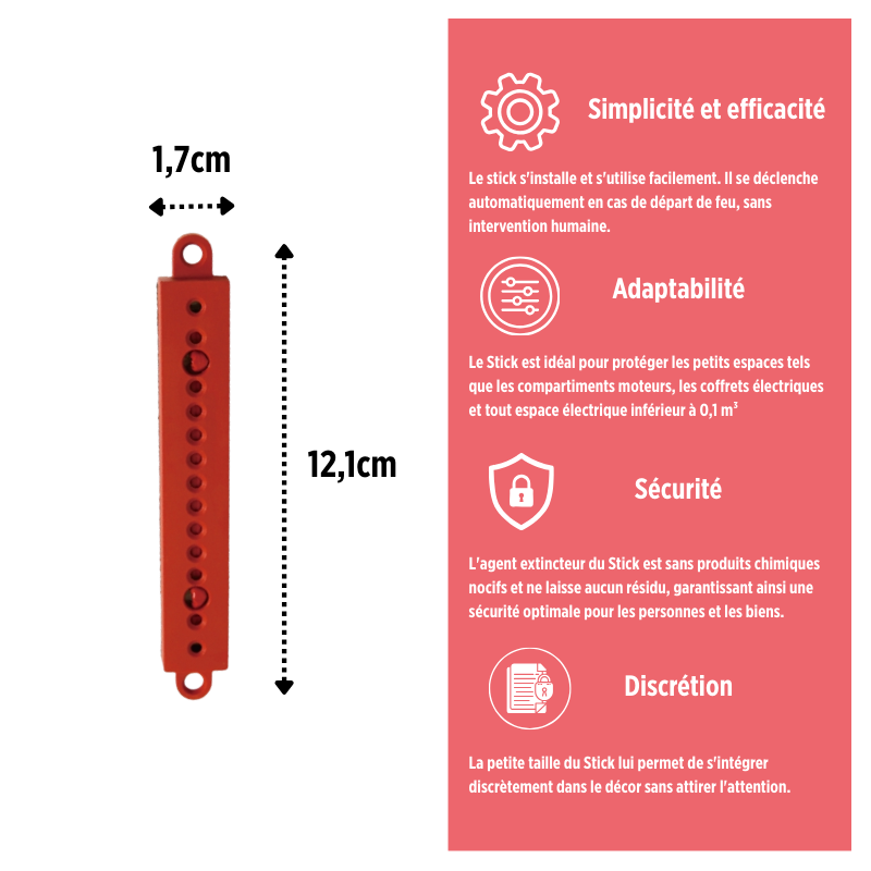 Lifebox Stick est une solution de protection incendie innovante, conçue pour s'installer discrètement dans des espaces réduits où le feu pourrait se déclarer. Il agit automatiquement en stoppant la combustion avant qu'elle ne devienne incontrôlable, offrant une sécurité optimale pour les équipements électriques et autres zones sensibles.